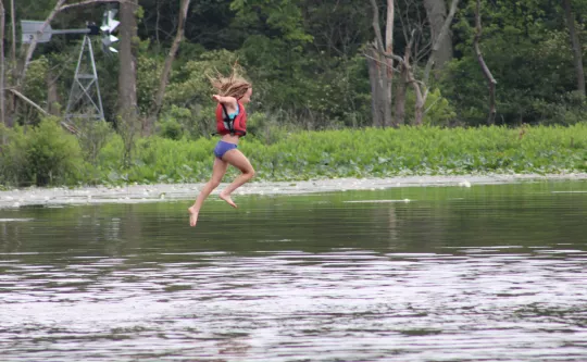 All waterfront activities must be supervised by an adult 18+. Everyone under 18 must wear a personal floatation device (PFD) while swimming. Everyone must wear a PFD regardless of age while jumping off the high dive and boating.^